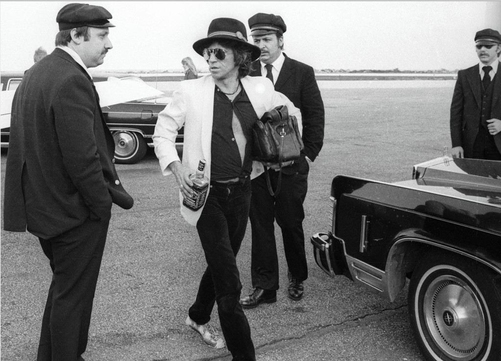 The New Barbarians foi um grupo montado para o disco solo de Ron Wood e sua turnê de 79. Era algo entre os projetos dos Rolling Stones, e Keith Richards foi parte dele, junto com Bobby Keys, Ian McLagan, Stanley Clarke e Ziggy Modeliste. Eles viajaram por todo o país naquele verão, voando em um jato enorme. Eu fui como fotógrafo, documentando o grupo. Em cada cidade, quando chegavamos, uma linha de limusines circulava o avião, e conforme cada membro da banda descia, ia direto para seu carro para ir até o hotel. Essa é uma foto de Richards recém-saido do avião, procurando sua limusine, garrafa de Jack e boom box nas mãos, coisas que não ia a lugar nenhum sem levar.