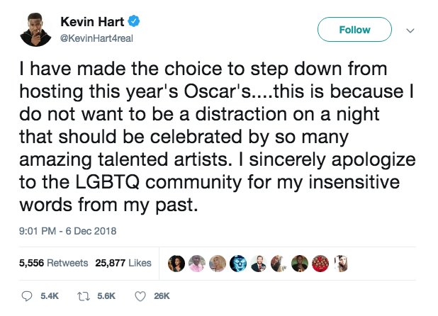“Peço sinceras desculpas à comunidade LGBTQ pelas palavras insensíveis do meu passado”, publicou Hart. Ele diz também que tomou a decisão de desistir do posto de apresentador de uma das maiores cerimônias da indústria cinematográfica pois não quer ser “uma distração em uma noite em que deve ser celebrada por tantos artistas incíveis”.
