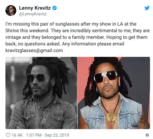 Lenny Kravitz perdeu o par de óculos favorito dele e pede ajuda aos fãs para encontrar