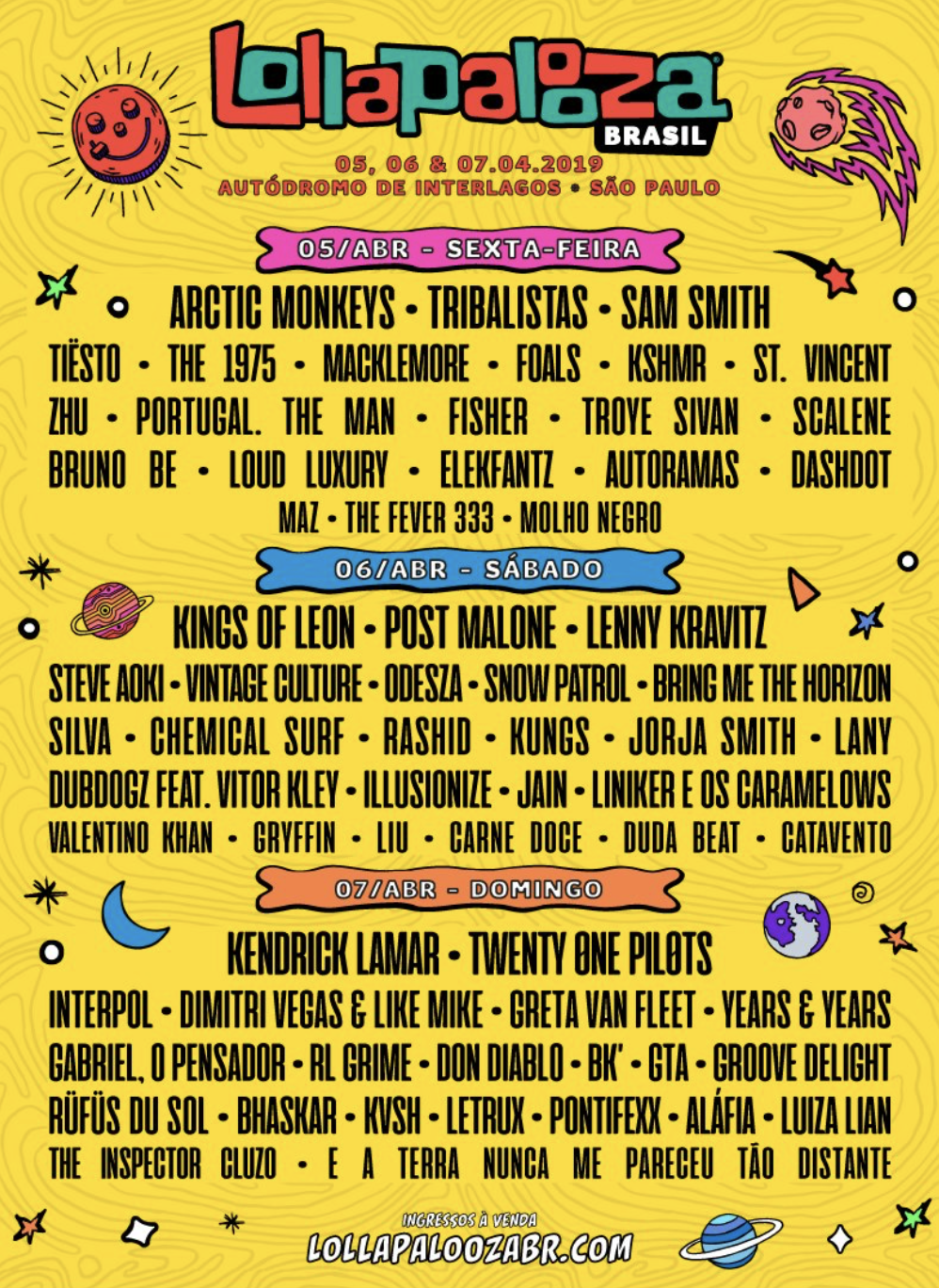 Saiu nesta quinta, 13, a divisão por dias do line-up do Lollapalooza 2019. As atrações haviam sido divulgadas no fim de novembro, e agora é possível ver quais bandas tocarão na sexta (6/04), no sábado (7/04) e no domingo (8/04).