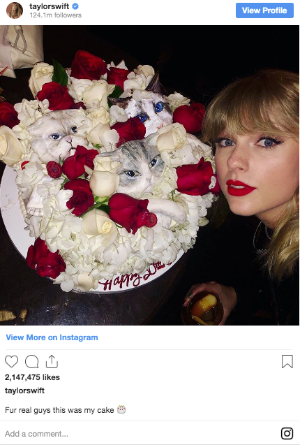 Na última sexta, 13, Taylor Swift fez 30 anos e compartilhou uma foto nas redes sociais que assustou um pouco os fãs: um bolo extremamente realista com esculturas comestíveis no formato da cabeça de seus gatos.