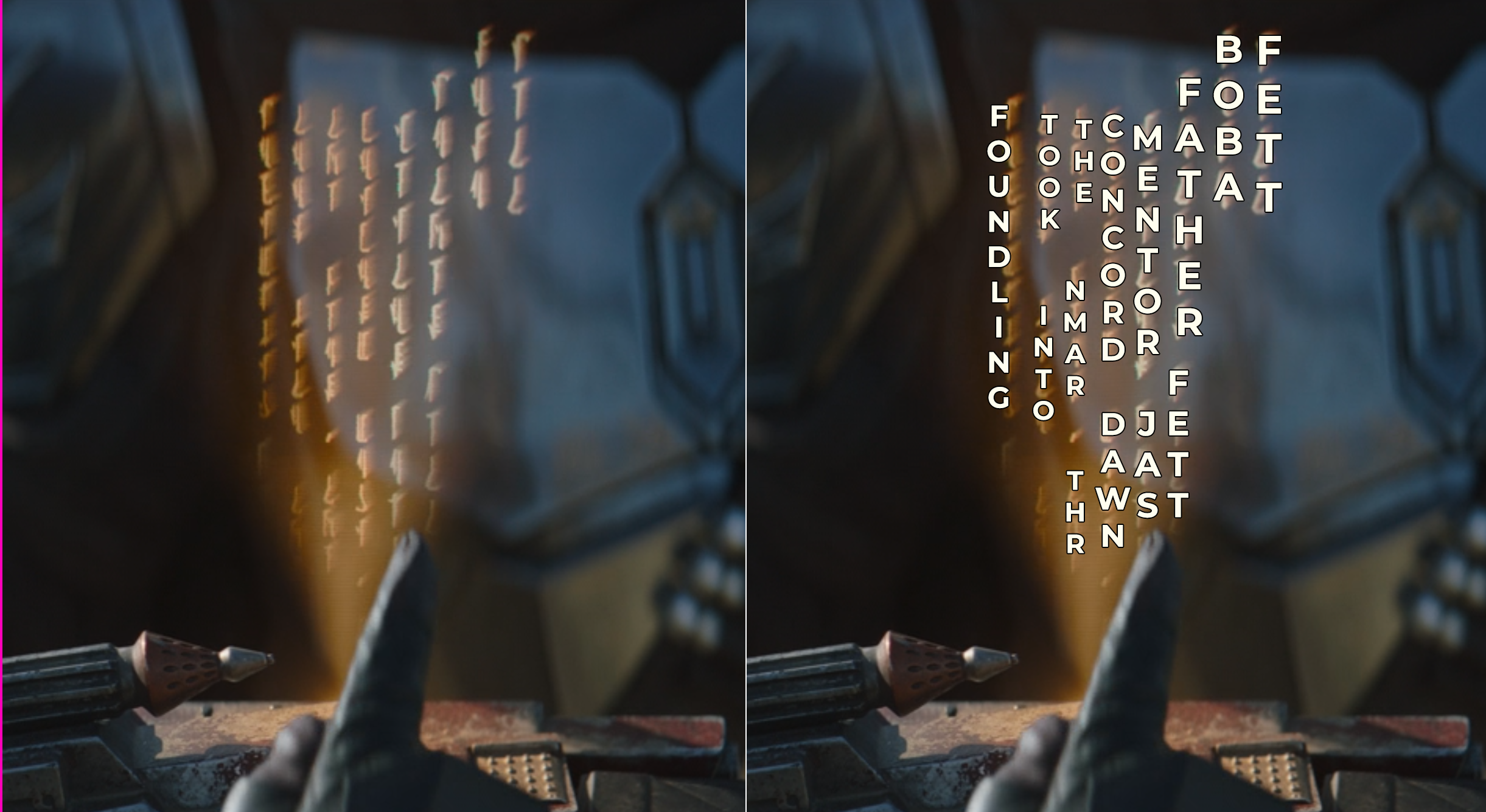 Não demorou para o usuário u/kinneroth, no Reddit, traduzir os símbolos holográficos mostrados na cena. Afinal, a mensagem foi escrita com letras do alfabeto mandaloriano, disponível na internet para consulta, tornando possível decifrar. O fã conseguiu traduzir o seguinte: