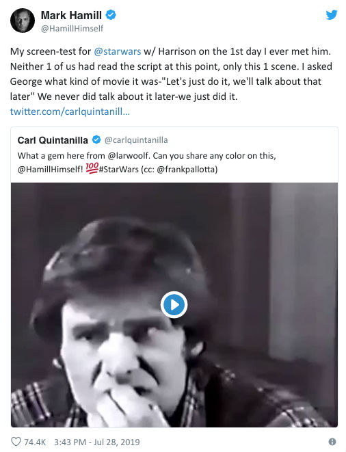 Mark Hamill compartilhou na última segunda, 30, o vídeo encontrado do primeiro teste que fez para entrar para o elenco de Star Wars. Na gravação, o ator passa uma cena com ninguém menos que Harrison Ford.