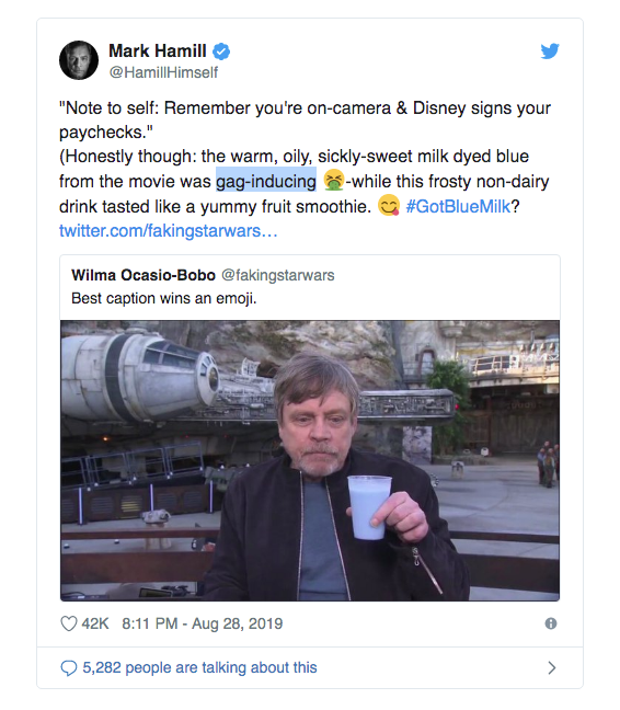 O ator comparou a bebida do parque com a que tomou durantes as filmagens da franquia em um post no Twitter. “Honestamente: o leite azul do filme era quente, oleoso, tão doce ponto de dar enjôo e ânsia, enquanto essa bebida gelada e sem leite tem gosto de um delicioso smoothie de fruta”, descreveu Hamill.