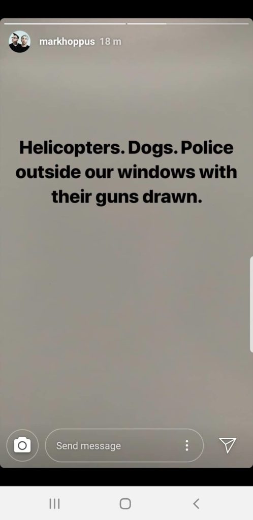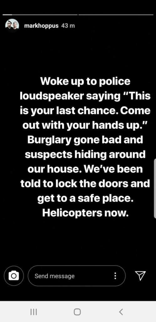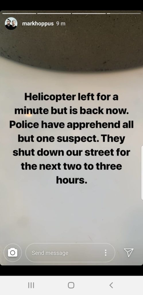 Sua última atualização no Instagram foi um post dizendo que a rua em que ele mora foi fechada durante duas ou três horas pela polícia.