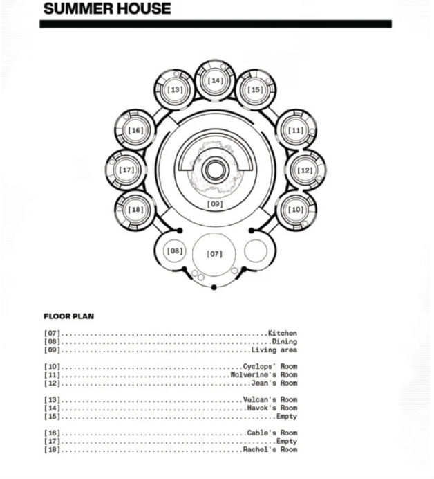 Como as edições de House of X e Powers of X, o novo quadrinho mostra informações extras sobre os personagens, como a planta da casa Summers. Apesar de ter uma plataforma de observação e um ginásio, o que se destaca é a área dos quartos.