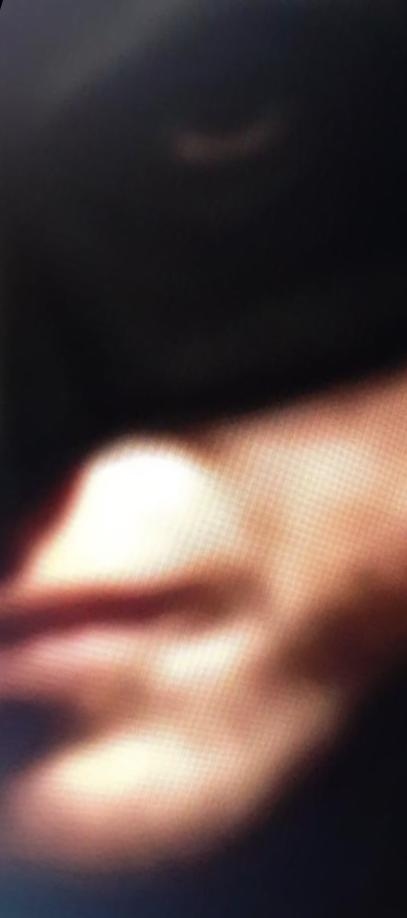 O clique está com pouca qualidade, mas mostra um olhar assustador e o acessório cobrindo o metade do rosto. A boca e o queixo são as únicas partes iluminadas da foto.