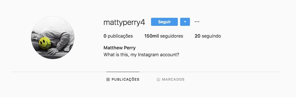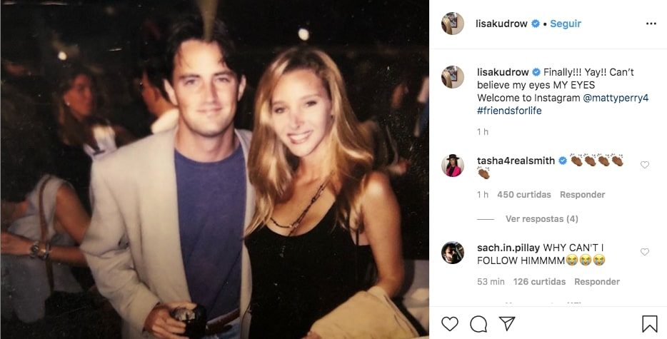Quem anunciou a chegada de Matthew Perry no Instagram foi a companheira de elenco de Friends, Lisa Kudrow, a Phoebe. A biografia do ator é uma típica frase do personagem dele na série: “O que é isso, minha conta do Instagram?” e a conta já ultrapassou 100 mil seguidores.
