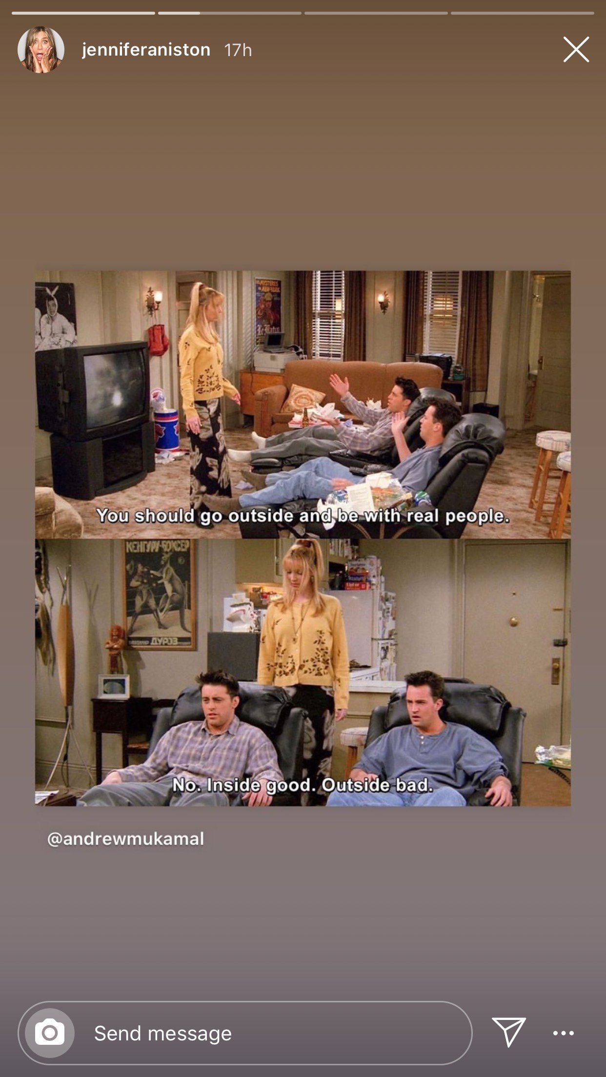 Aniston usou os stories do Instagram. A atriz repostou uma publicação do usuário @andrewmukamal, que mostra um diálogo entre Phoebe, Joey e Chandler. A cena mostra a personagem de Lisa Kudrow em um “briga” com os dois amigos: Vocês deveriam sair na rua e ficar com pessoas reais”.