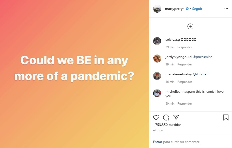 Perry postou no feed uma frase no melhor estilo Chandler Bing: “Poderíamos estar em uma pandemia maior?”.