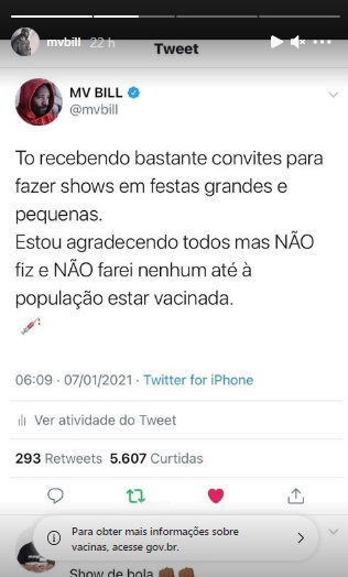 Através de suas redes sociais, MV Bill escreveu: “Estou recebendo bastante convite para fazer shows em festas grandes e pequenas. Estou agradecendo todos, mas não fiz e não farei nenhum até a população estar vacinada”.