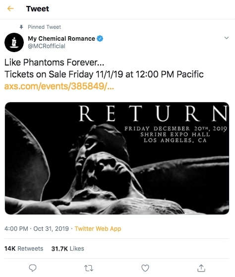 Ao que tudo indica, o My Chemical Romance está de volta. Parcialmente, pelo menos: a banda anunciou no Twitter nesta quinta, 31, um evento para o dia 20 de dezembro deste ano. O título é “Return” (“retorno,” em português).
