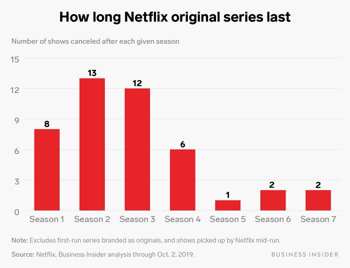 Em outubro de 2019, a Business Insider realizou uma pesquisa sobre quantas temporadas foram disponibilizadas para uma série original da Netflix antes dela ser cancelada. No estudo foram excluídas minisséries (como Alias Grace), produções em que a Netflix concede os direitos de primeira execução (como Better Call Saul) e séries que foram adicionadas no catálogo no meio da execução (como Lucifer).