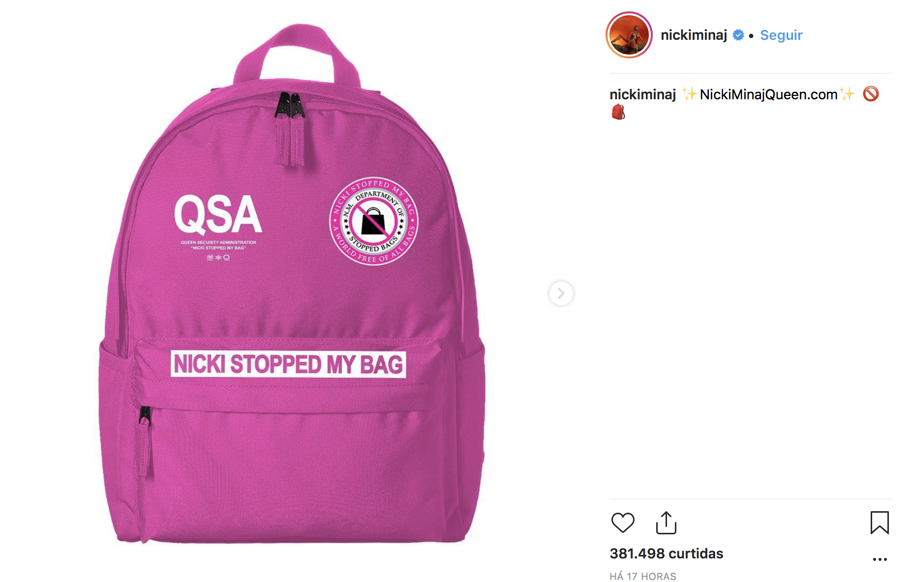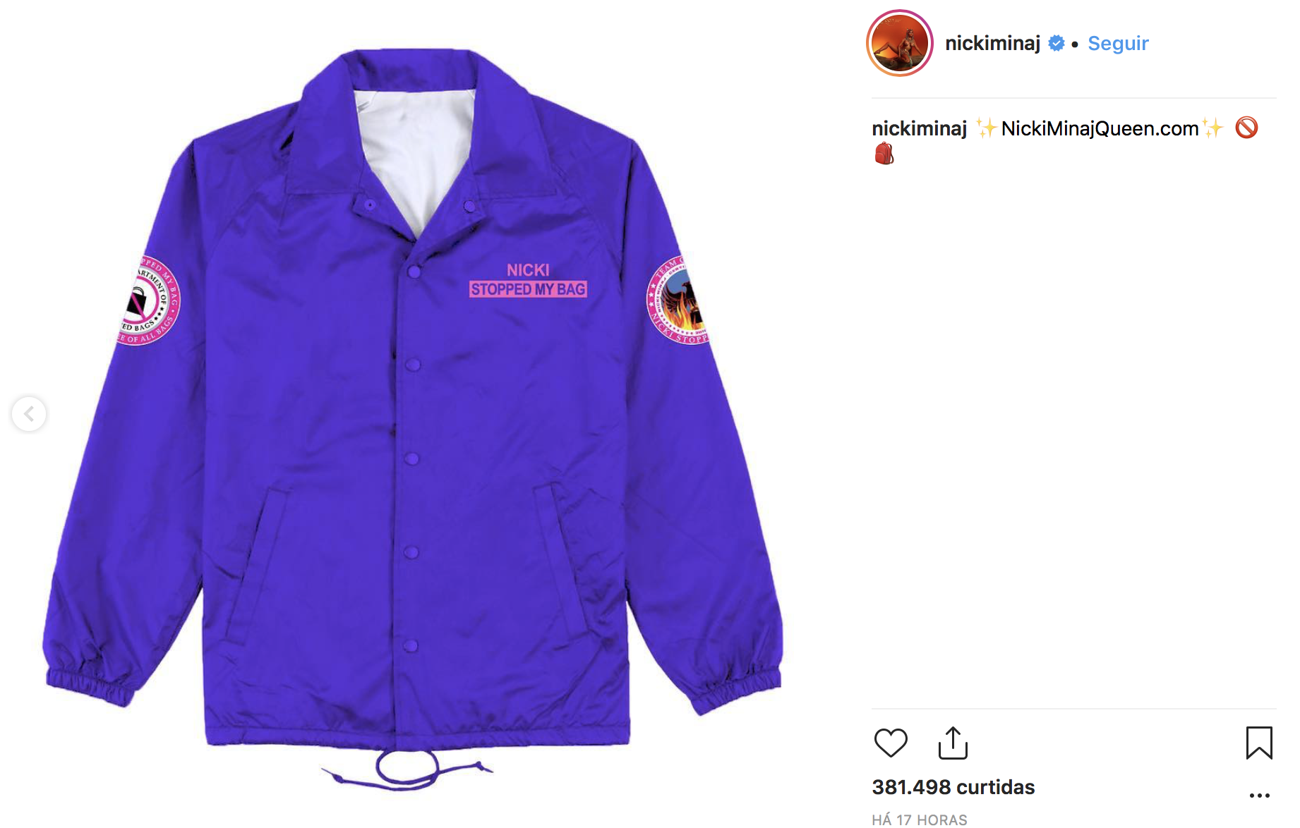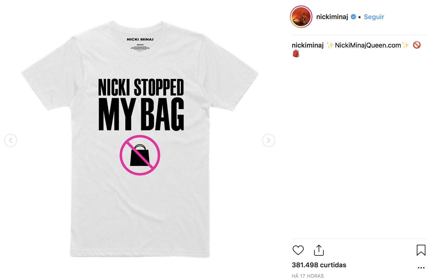 Nicki Minaj compartilhou no Instagram na última quinta, 4, imagens da nova coleção de roupas e acessórios que estão à venda em seu site. As peças levam a frase “NICKI STOPPED MY BAG”, uma referência direta e irônica à briga em que a rapper se envolveu com Cardi B durante a Fashion Week.