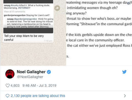 Em uma segunda imagem, o líder da High Flying Birds, respondeu diretamente a Liam e diz que ele “sempre foi bom em intimidar mulheres”, além de relembrar de um episódio em 2018, em que Liam foi acusado de pegar sua namorada Debbie Gwyther pela garganta em um corredor de uma boate.