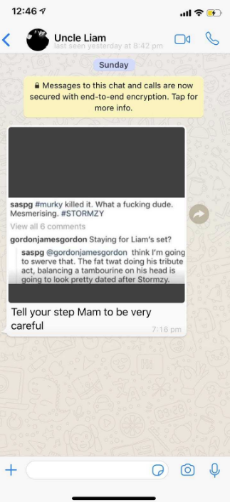 Noel publicou no Twitter a captura de tela de uma conversa em que Liam tenta intimidar a sua esposa