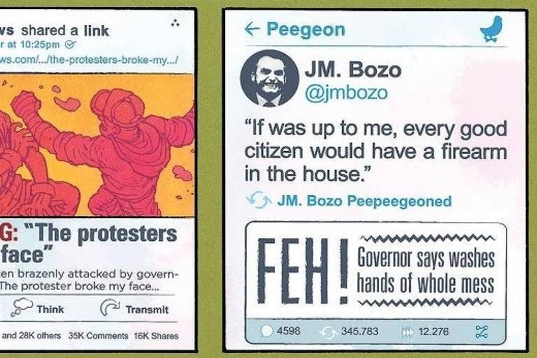 Um dos paineis da página mostra um post na rede social Peegeon (paródia de Twitter) feito por um usuário chamado JM Bozo, no qual ele escreve: “Se dependesse de mim, todo cidadão de bem teria uma arma de fogo em casa”.
