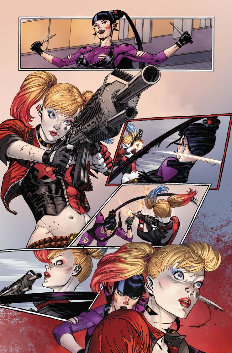 Em novas prévias de Batman #93, escrito por James Tynion IV e com Guillem March e Javier Fernandez responsáveis pela arte, Punchline e Arlequina brigam feio por conta da obsessão e inveja de Punchline pela ex-namorada do atual parceiro dela. É uma cena chocante que mostra o quão mortal é a vilã.