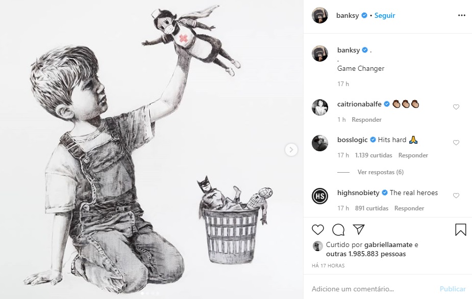 Banksy revelou a mais nova obra dele na quarta-feira, 6, no Hospital da Universidade de Southampton, na Inglaterra. De acordo com a BBC, o artista anônimo deixará a obra no local até depois do fim da pandemia e, em seguida, irá leiloá-la para ajudar as instituições Serviço Nacional de Saúde britânico – NHS.