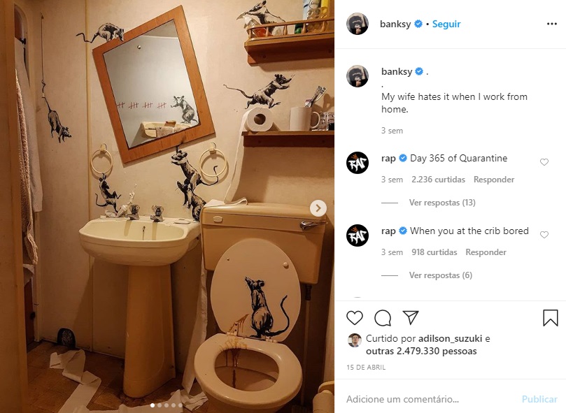 A obra também foi divulgada em um post do Instagram de Banksy ao lado da legenda: “Quem Vira o Jogo”. Esta é a segunda obra dele sobre a pandemia do coronavírus. No dia 15 de abril, o artista compartilhou uma imagem de um banheiro coberto de ratos desenhados e escreveu: “Minha esposa odeia quando eu trabalho de casa”.