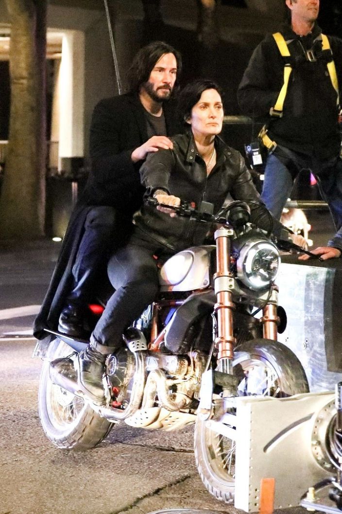 O casal aparece andando de motocicleta pelas ruas da simulação da Matrix. Keanu Reeves já tinha aparecido em fotos anteriores, mas é a primeira vez que a colega Carrie-Anne Moss também é vista.