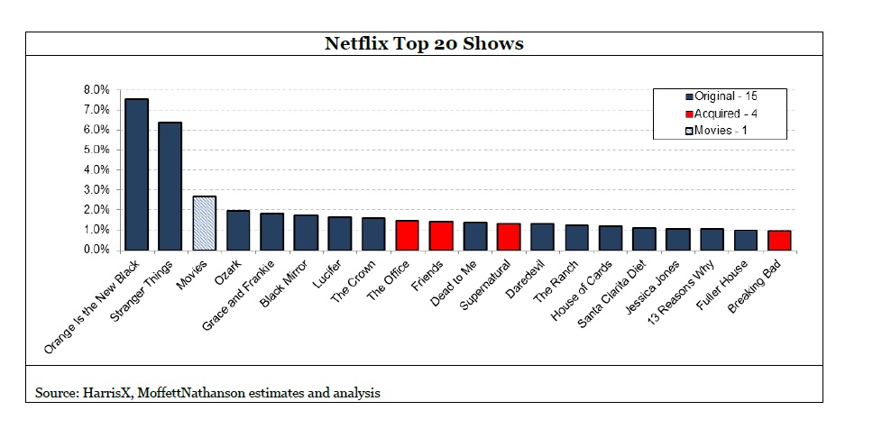 Dos 99 programas de TV mais citados da Netflix na pesquisa MoffettNathanson / HarrisX, 51 eram originais da Netflix, 42 eram programas de TV licenciados e seis não estão na Netflix, o que gera uma certa confusão no consumidor sobre onde eles assistem os seus favoritos.