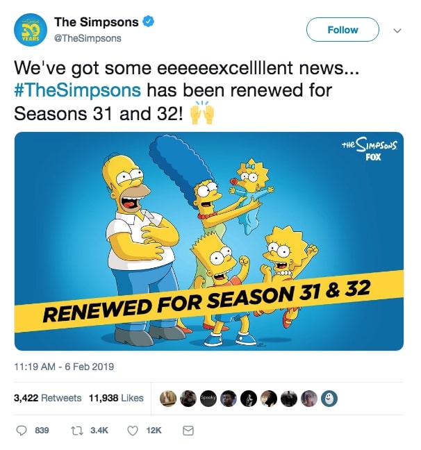 A conta oficial dos Simpsons no Twitter revelou que o canal Fox renovou a série para mais duas temproadas! Sendo assim, a família mais querida dos desenhos animados retorna à TV para os seus 31º e 32º anos.