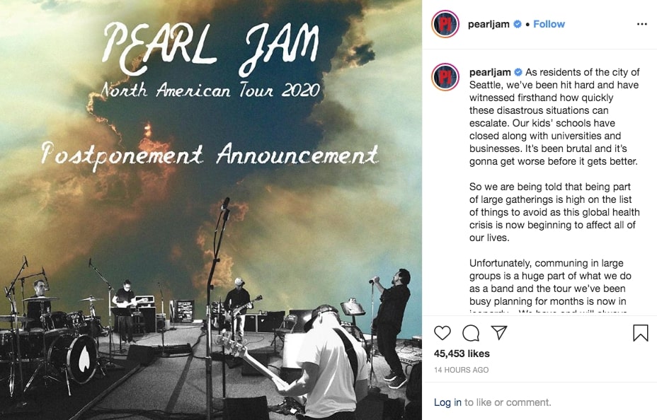Nesta segunda, 9, Pearl Jam anunciou que parte da turnê na América do Norte será adiada devido ao surto de Coronavírus. O anúncio foi feio no perfil do Instagram do grupo.