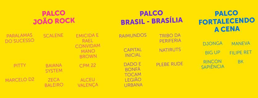 As apresentações serão em três palcos: Palco João Rock, Palco Brasil – Brasília e Palco Fortalecendo a Cena.