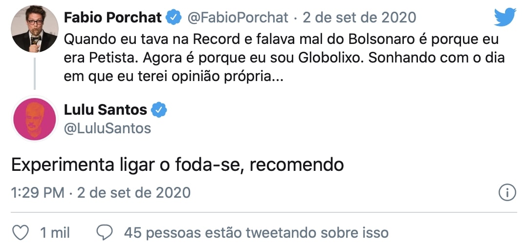 Como destacado pelo site da Revista Fórum, o comediante Fábio Porchat foi ao Twitter para demonstrar insatisfação com a constante onda de reclamações que recebe por falar mal do presidente Jair Bolsonaro. E Lulu Santos respondeu o tuíte com um conselho bem direto.