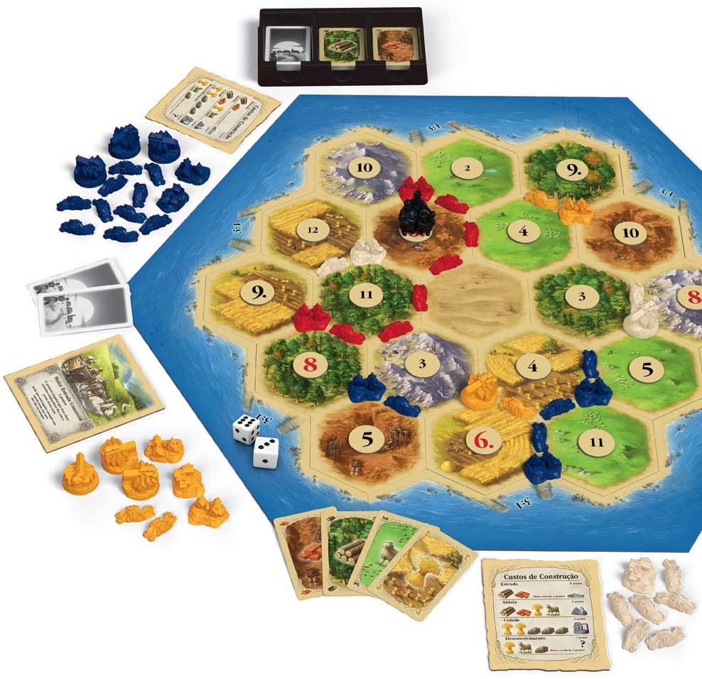 O jogo mais clássico desta lista está há quase 10 anos no Brasil (veio da Alemanha). Nele, você precisa construir sua cidade usando quatro recursos básicos: madeira, argila, feno e gado. Você os consegue dependendo do lugar, no tabuleiro, onde está sua vila – e se a sorte nos dados te agraciar. Troque-os e chantageie seus colegas. Consegue crescer mais que os outros jogadores? – https://amzn.to/2WMDU9e