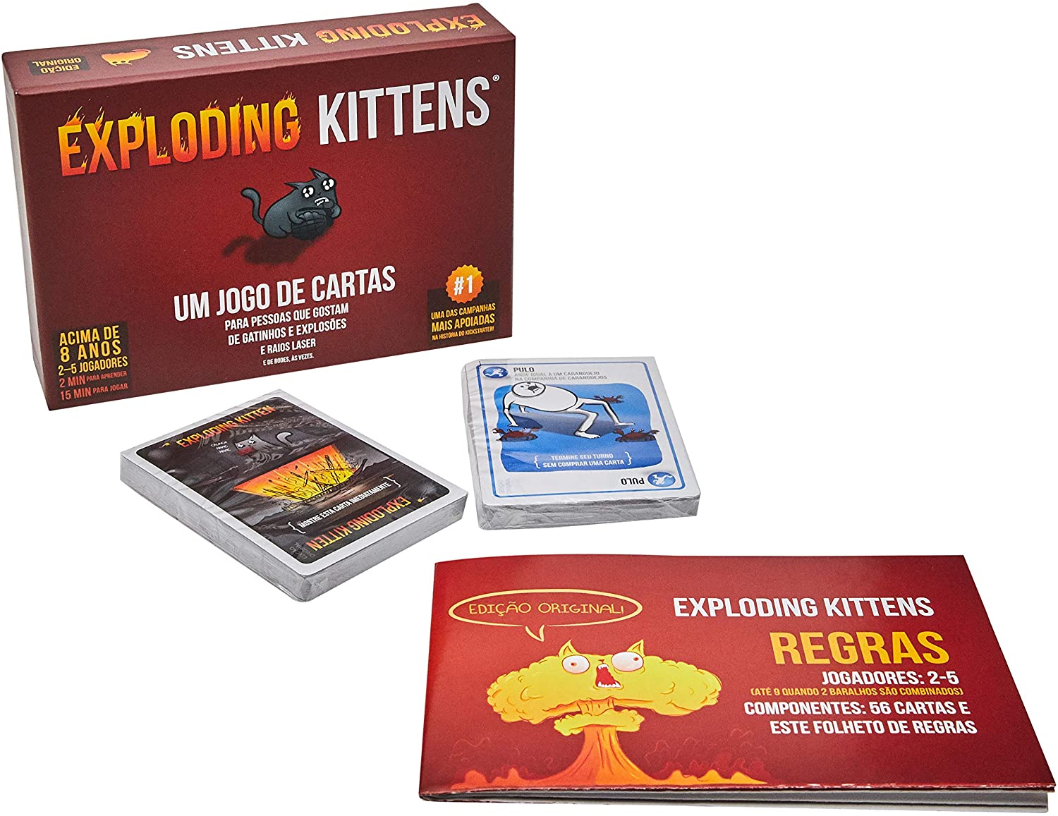 Um resumo da internet: gatos, arco-íris, explosão! Os jogadores se revezam comprando cartas – e torcendo para não ser um gatinho explosivo. Quem a comprar, perde. Porém, há diversas cartas no jogo para “driblar” a má sorte: imunidade, dar uma “espiadinha”, passar a vez para o colega… – https://amzn.to/2JldUKg
