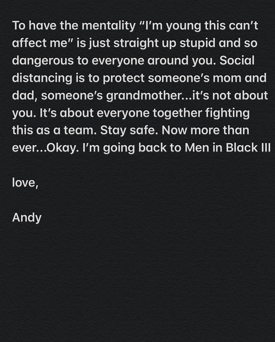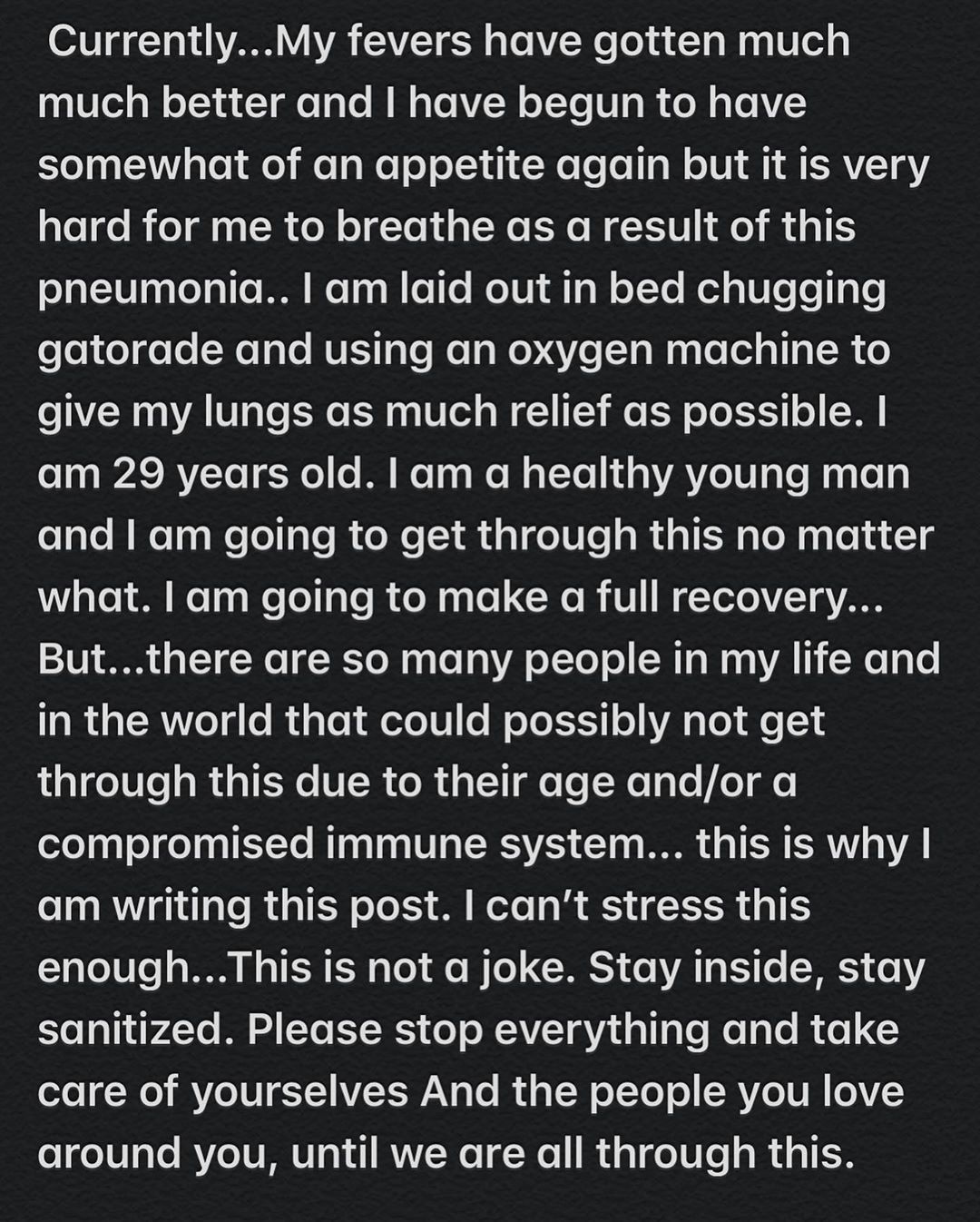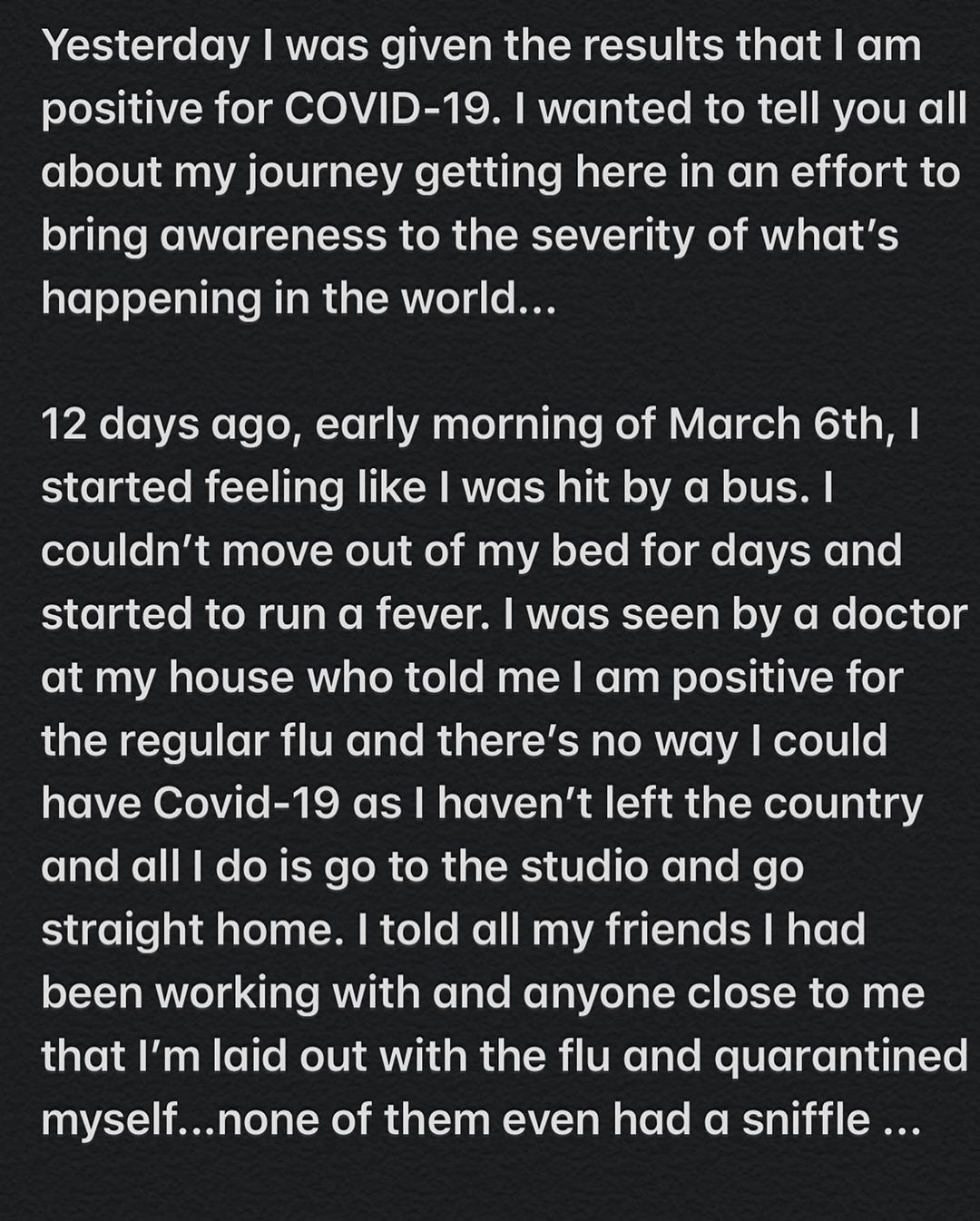 “Ontem recebi os resultados positivos para o COVID-19. Por isso, quero contar um pouco sobre minha jornada e tentar conscientizá-los sobre a gravidade do que está acontecendo no mundo. Há 12 dias, na manhã do dia 6 de março, comecei a sentir que havia sido atropelado por um ônibus. Eu não conseguia sair da minha cama por dias e comecei a ficar com febre. Fui atendido por um médico em minha casa que me disse que eu estava com gripe comum e não havia possibilidade de eu ter contraído o COVID-19 por não ter saído do país. A única coisa que eu faço é ir ao estúdio e depois ir para casa”.