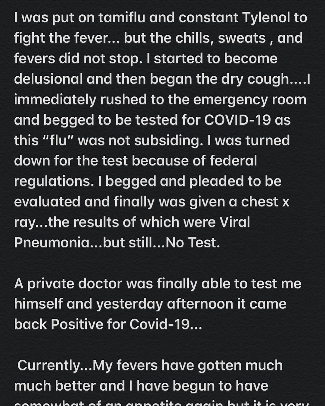 “Tomei tamiflu e Tylenol constamente para tentar combater a febre, mas os calafrios e suores não pararam. Até o momento em que comecei a delirar e depois tive uma tosse seca. Nesse momento, fui imediatamente para a sala de emergência de um hospital e implorei para fazer o teste para COVID-19, já que essa “gripe” não estava diminuindo. Fui recusado para o teste por causa dos regulamentos federais. Implorei para ser avaliado e, finalmente, recebi uma radiografia de tórax cujo resultado alegou uma pneumonia viral. Mas ainda assim, sem teste para o coronavírus. Só após conseguir uma consulta com um médico particular finalmente consegui a resposta do exame que alegou que estou com COVID-19″.