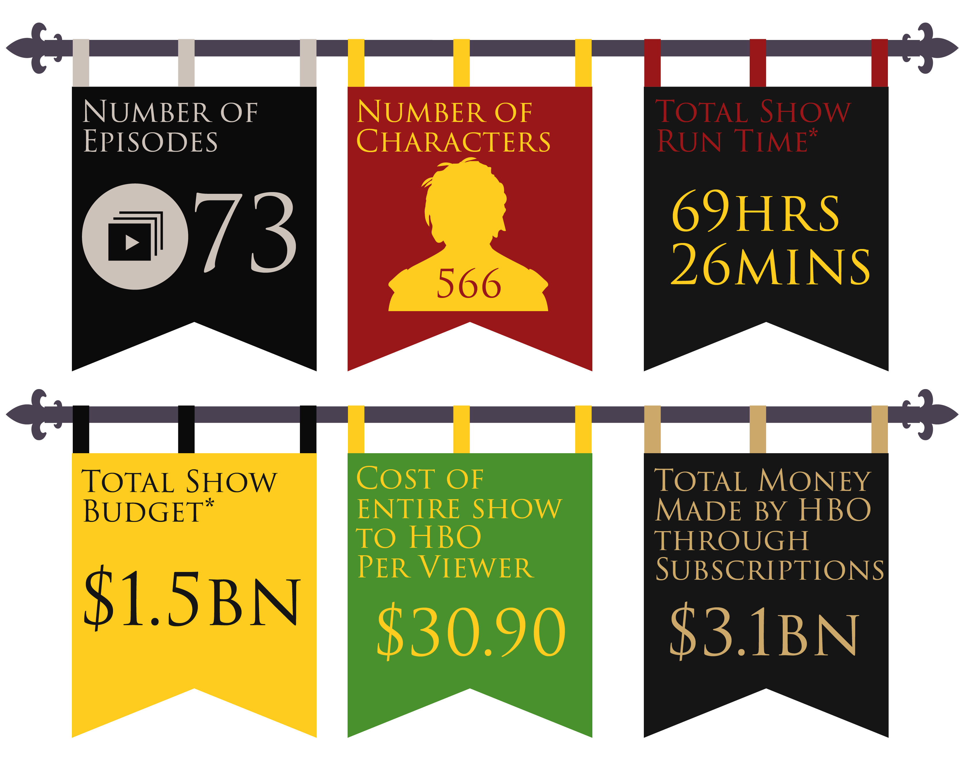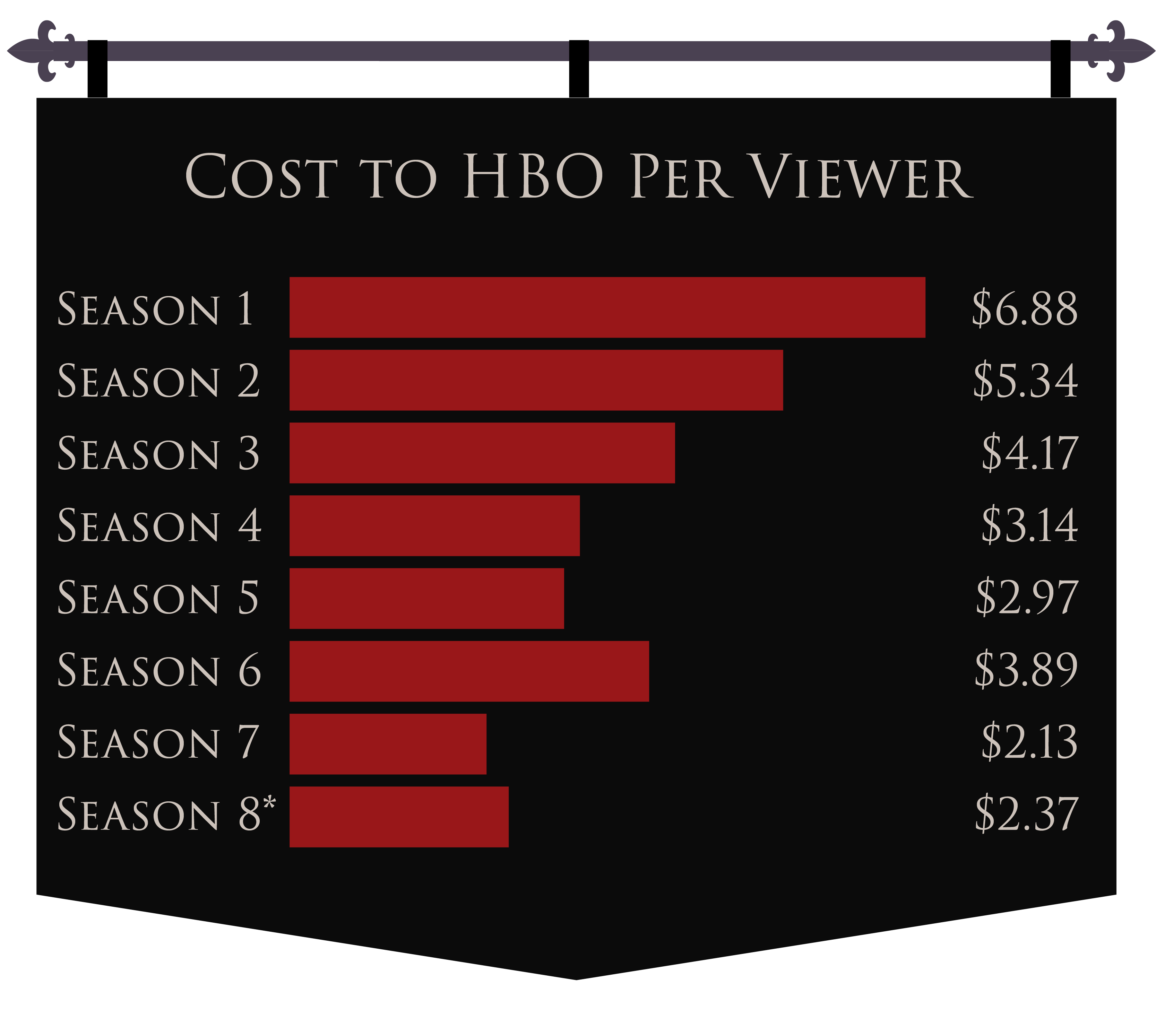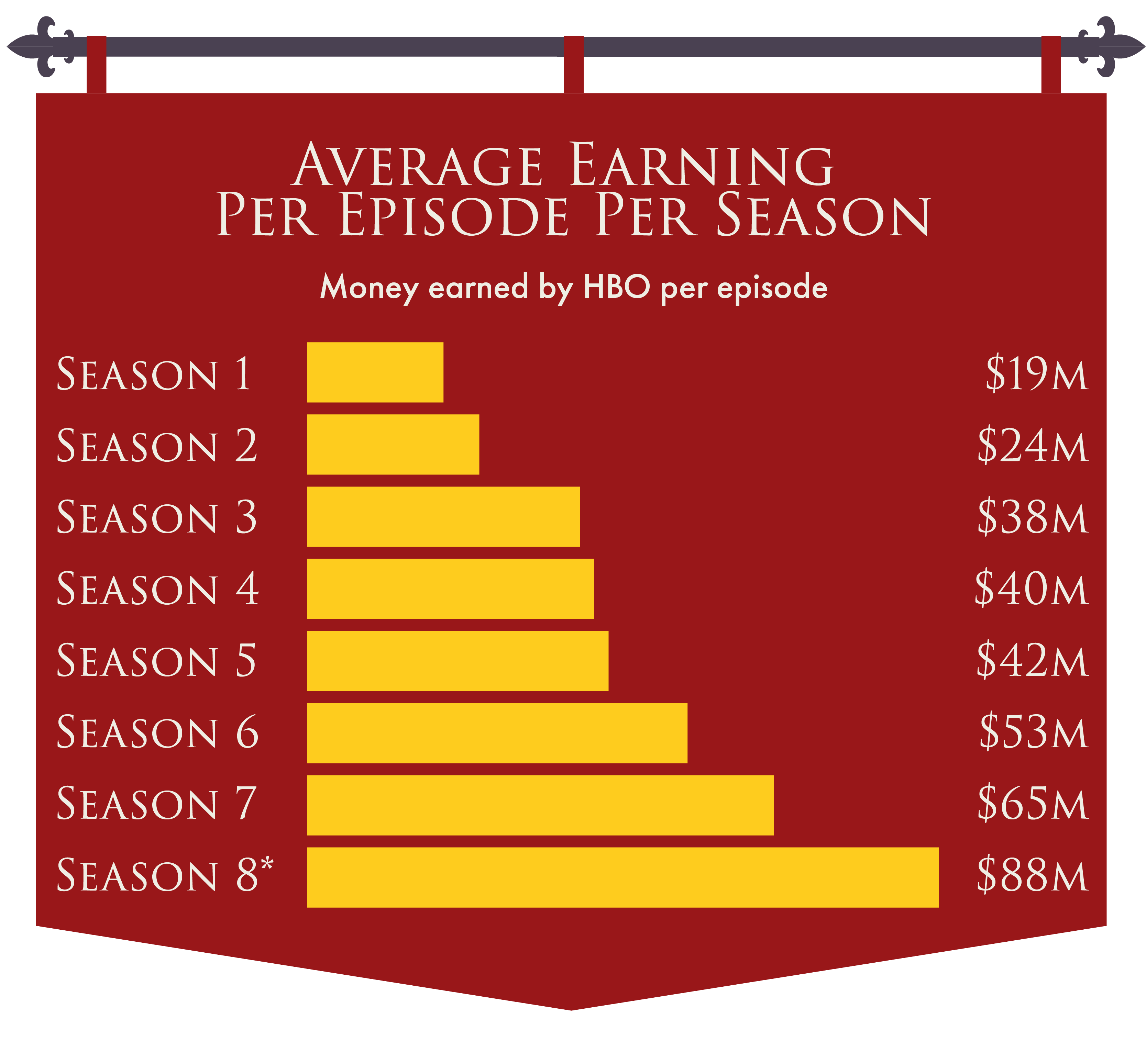 A série baseada na obra de George R.R. Martin apresentou números crescentes de lucro por episódio em cada temporada, os quais foram de US$19 milhões para US$88 milhões, e diminuiu o custo por espectador ao longo dos anos, com exceção da sexta temporada. Além disso, a produção ganhou US$ 3.1 bilhões por meio das assinaturas da plataforma da HBO.