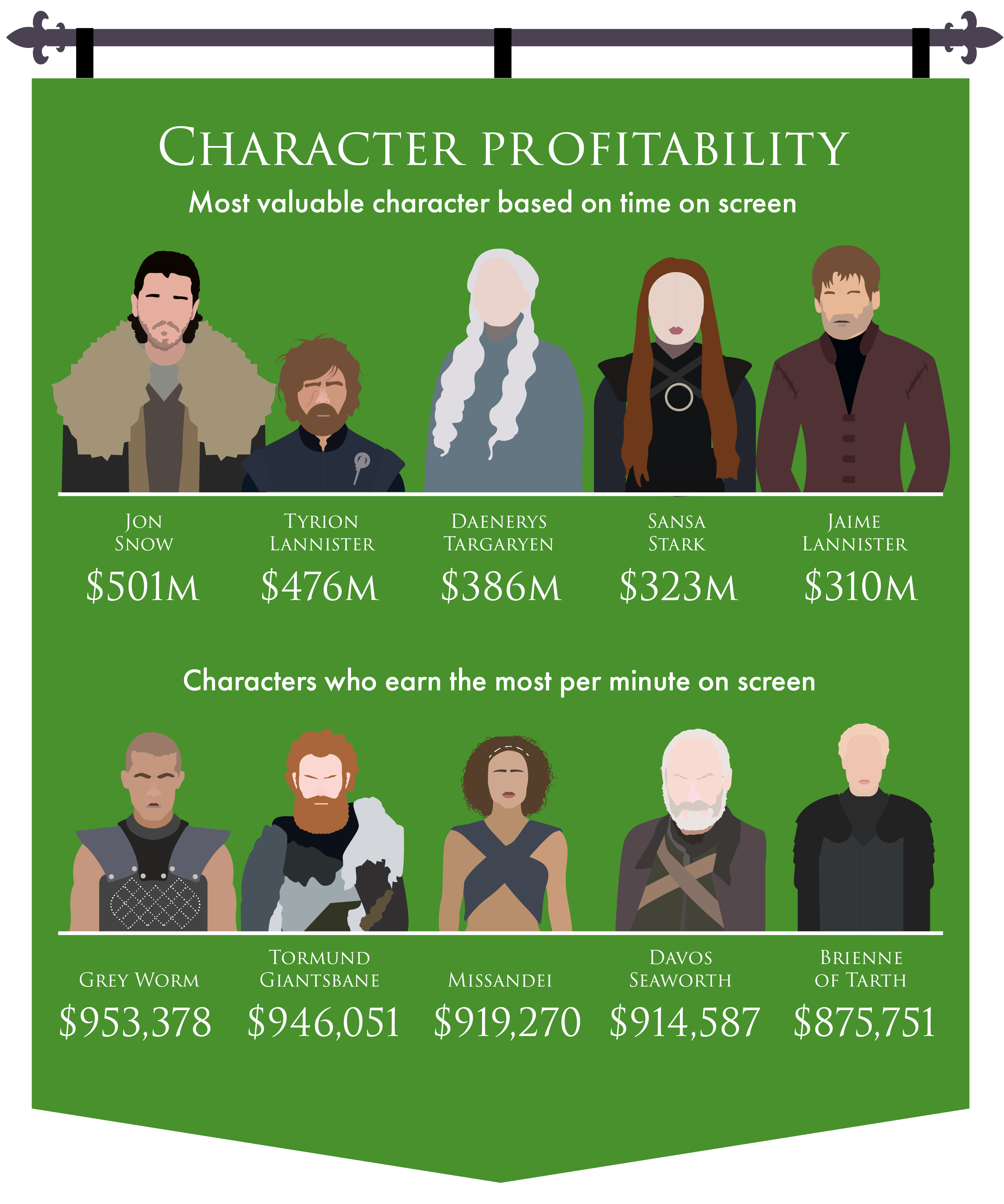 Jon Snow foi o protagonista mais valioso da série e rendeu US$ 501 milhões, enquanto Grey Worm foi o personagem que mais ganhou dinheiro por minuto de aparição e acumulou US$ 953. 378.