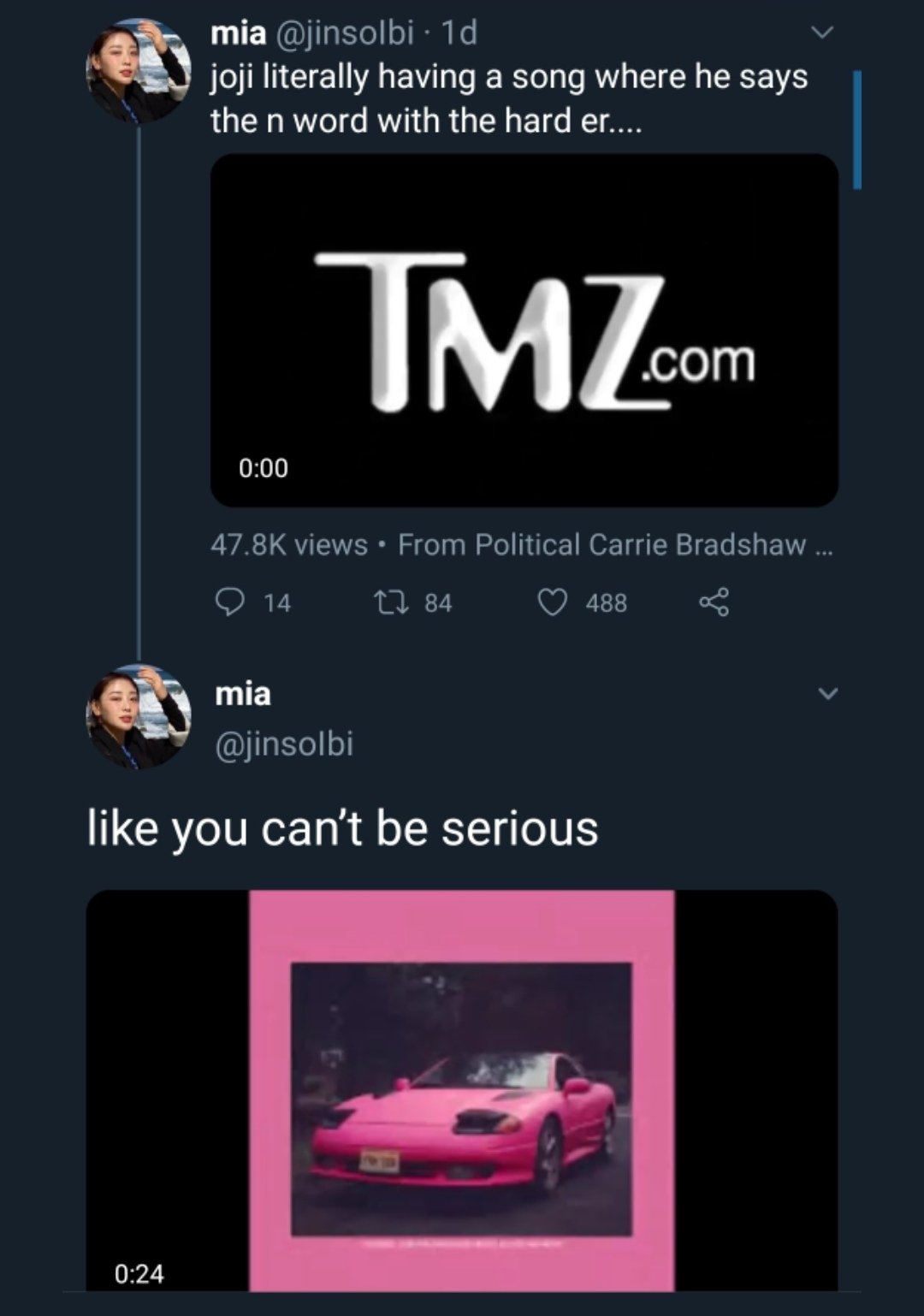 Na última segunda, 11, alguns usuários do Twitter, familiarizados com o cantor, descobriram a carreira dele como Filthy Frank e Pink Guy. Uma conta escreveu: “Joji literalmente tem uma música onde ele diz a ‘n word’ com ‘n’ maiúsculo”, em seguida colocou o trecho de uma canção do personagem rosa e disse: “Tipo, você não pode estar falando sério”.