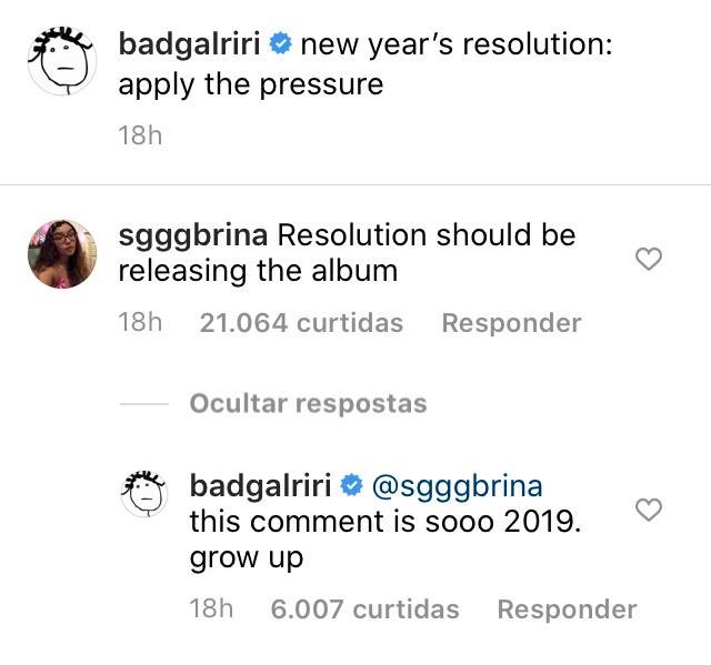 Em seu mais recente post no Instagram, que nada tem a ver com música e mostra o look de Rihanna usado no Réveillon, uma fã escreveu que “a resolução [para 2021] seria ela lançar o novo álbum”. A dona dos hits Umbrella, Work e Diamonds, não demorou para rebater: “Esse comentário é tão 2019. Cresça!”.