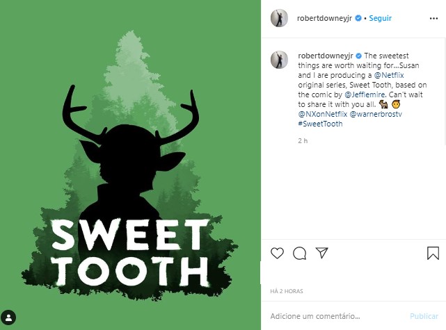 Nesta terça, 12, o Deadline revelou que a Netflix encomendou uma temporada completa de Sweet Tooth, que será uma série baseada na HQ da Vertigo criada por Jeff Lemire. Mais tarde, no Instagram, Robert Downey Jr. confirmou a notícia ao contar que ele quem produzirá o seriado ao lado da esposa Susan Downey.