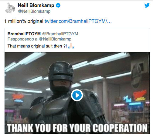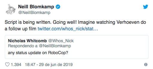 “Script está sendo escrito. Indo bem! Imagine assistir Verhoeven fazendo uma sequência do original”, escreveu Blomkamp no Twitter, ao ser questionado sobre o status da produção. Veja abaixo ou aqui.
