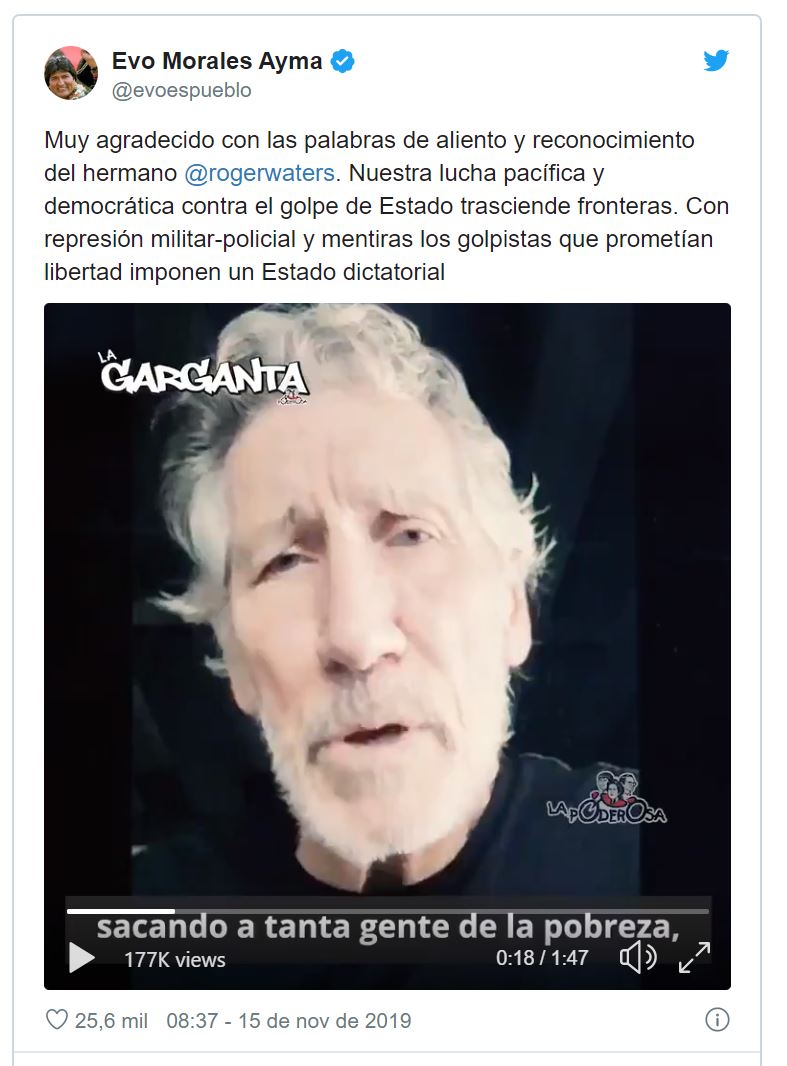 “Muito grato pelas palavras de alento e reconhecimento do irmão Roger Waters”, escreve Morales no tuíte de resposta. “Nossa luta pacífica contra o golpe de Estado transcende fronteiras.”