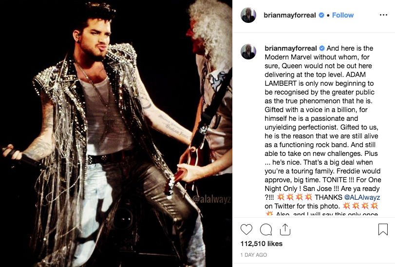 “Dotado de uma voz em um bilhão, ele é um perfeccionista apaixonado. Ele é a razão pela qual ainda estamos vivos com uma banda de rock em funcionamento e sendo capaz de assumir novos desafios. Além disso… ele é legal. Isso é um grande negócio quando você tem uma família em turnê. Freddie aprovaria, grande momento.”, escreveu May.