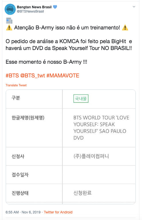 A gravadora do BTS, Big Hit Entertainment, lançará um DVD dos shows feitos no Brasil. A produção se chamará BTS World Tour ‘Love Yourself: Speak Yourself’ Sao Paulo e mostrará a passagem dos k-idols pela cidade e o shows feitos nos dias 25 e 26 de maio de 2019, no Allianz Parque.