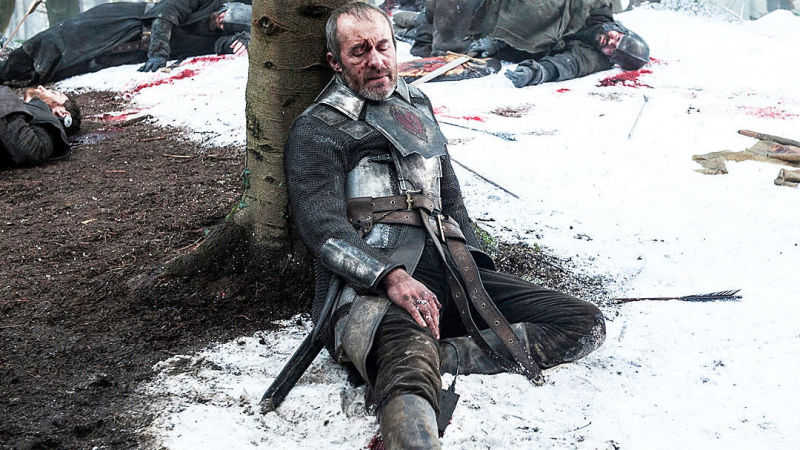 Game of Thrones aconteceu muito antes que as pessoas usassem eletricidade ou aparelhos eletrônicos. Mas Stannis Baratheon era privilegiado. Neste episódio, na cena em que ele morre, dá para ver um cabo de um laptop passando por debaixo de sua perna. A foto é “por detrás da cena”, mas mesmo com todo o trabalho, na edição final ainda dá para ver o fio.