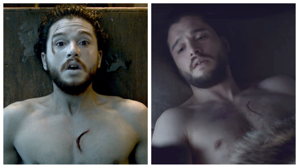 Jon Snow aparece com um corte profundo em formato de lua crescente em seu peito. Mas a cicatriz parece se mover, pois em outra cena aparece vários centímetros acima da onde o machucado aconteceu.