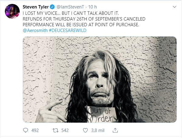 “Eu perdi a minha voz… Mas não posso falar sobre isso. Os reembolsos para a performance cancelada de quinta-feira, 26 de setembro, serão pagos nos pontos de compra de ingressos. @Aerosmith #DEUCESAREWILD”, escreveu Tyler no Twitter.