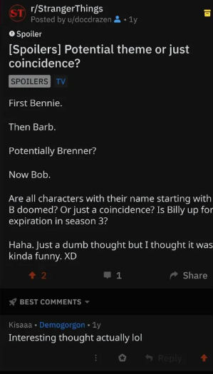 Vamos relembrar o nome de algumas vítimas das três temporadas: Benny Hammond, Barbara Holland, Bob Newby, Bruce Lowe e Billy Hargrove. Sim, todos eles começam com a letra B e foi exatamente isso que foi notado ainda na segunda temporada pelo fã, que previu a morte do jovem antagonista Billy.