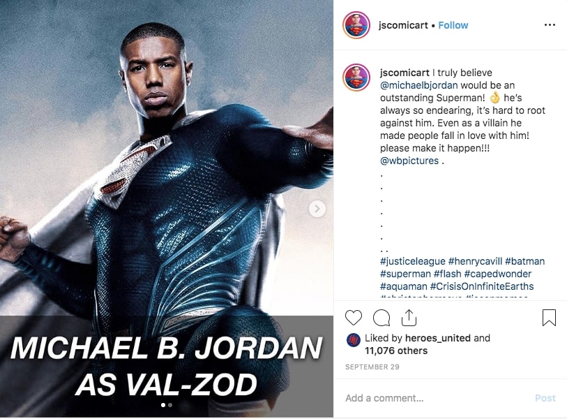 Em outubro, o ilustrador que se identifica como Jscomicart no Instagram publicou uma arte com Michael B. Jordan como Val-Zod, o Superman da Terra 2.
