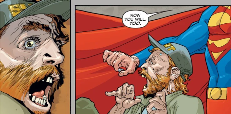 Ele chega em supremacistas brancos que mentem sobre a compra. No entanto, como o protagonista consegue ouvir os batimentos cardíacos das pessoas, ele logo percebe qual é a verdade. Superman então pega uma arma e atira no rival.