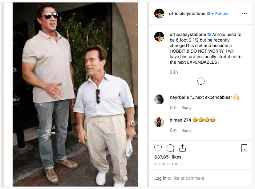 E brincou: “Arnold costumava ter 1,90 de altura, mas ele acabou de mudar a sua dieta e tornou-se um HOBBIT! Não se preocupe, eu vou tê-lo profissionalmente esticado para os próximos Os Mercenários!”